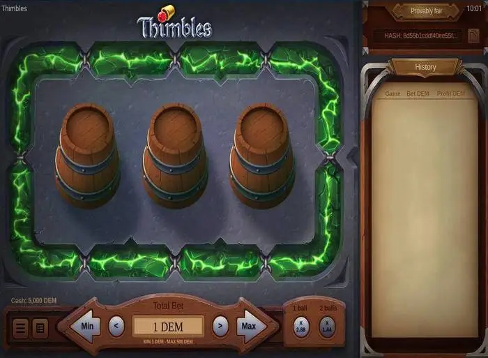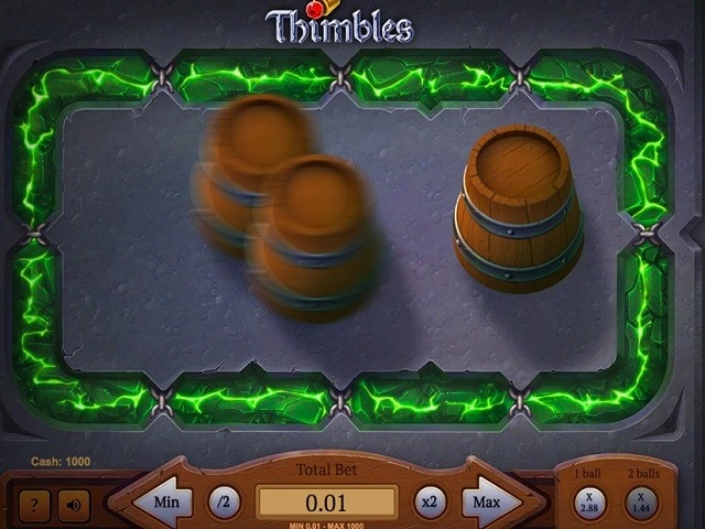 Poiché Thimbles è un gioco di carnevale, EvoPlay è riuscita a fornire una variante diversa del gioco. Vengono mostrati tre barili di legno, con la pallina rossa posizionata in uno o due di essi. L’effetto di rimescolamento dei barili aiuta i clienti a provare le sensazioni del gioco dal vivo. Il sistema audio si adatta perfettamente al gameplay per aumentare il livello di eccitazione durante il gioco. Ogni volta che si preme il pulsante delle impostazioni, è possibile modificare il volume.